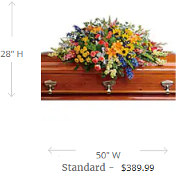 Green hydrangea, orange roses, yellow spray roses, orange asiatic lilies, red gladioli, large yellow sunflowers, blue delphinium, orange snapdragons, light yellow stock, purple matsumoto asters, and yellow button spray chrysanthemums are accented with green trick dianthus, blue eryngium, bupleurum, dusty miller, huckleberry, sword fern, lemon leaf.