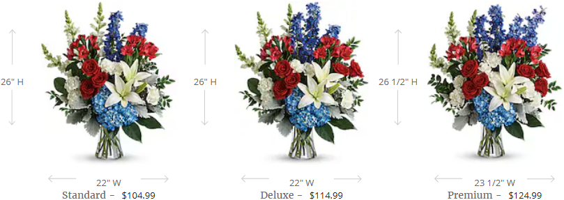 This bouquet features blue hydrangea, red roses, white asiatic lilies, red alstroemeria, white carnations, blue delphinium, white snapdragons, huckleberry, dusty miller, aralia leaf and lemon leaf. Delivered in a gathering vase.