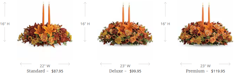 Orange roses, asiatic lilies, dark orange alstroemeria, bronze button spray chrysanthemums, yellow and rust cushion spray chrysanthemums and fall foliage are exquisitely gathered in this center-of-attention piece.