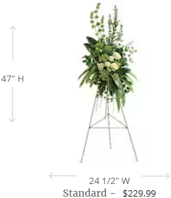 This tranquil spray of miniature green hydrangea, green roses, green trick dianthus, and bells of Ireland is accented with bupleurum, myrtle, sword fern, variegated aspidistra leaves, aralia leaf, bear grass, and lemon leaf. Delivered with a wire easel.