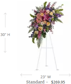 A lovely assortment of flowers such as pink roses, larkspur, asiatic lilies, gerberas and sinuata statice, with peach roses and carnations, purple stock and limonium, and bells of Ireland on a classic easel.