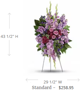 This regal spray includes lavender roses, lavender alstroemeria, lavender gladioli, lavender stock, purple cushion spray chrysanthemums, purple sinuata statice, green ti leaves, flat cedar, oregonia and lemon leaf.