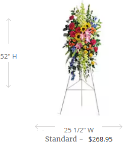 This spray features hot pink roses, yellow roses, orange spray roses, pink asiatic lilies, green gladioli, green carnations, medium yellow sunflowers, blue delphinium, bupleurum, myrtle, sword fern, silver dollar eucalyptus, and lemon leaf. Delivered on a wire easel.