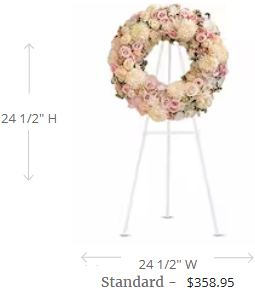 Gorgeous pink hydrangea, crème roses, light pink spray roses, white chrysanthemums, waxflower and more are adorned by pink organza ribbon in this eternal circle of peace.