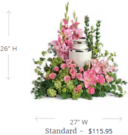 This pretty arrangement includes miniature green hydrangea, pink spray roses, pink asiatic lilies, pink alstroemeria, pink gladioli, pink carnations, green carnations, bupleurum, green ivy, myrtle, ming fern, and lemon leaf. Arrangement does not include urn.