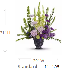 The serenely beautiful bouquet includes green gladioli, lavender stock, green carnations, purple carnations, lavender spider chrysanthemums, bells of Ireland and purple sinuata statice, accented with assorted greenery. Delivered in a timeless tribute urn.