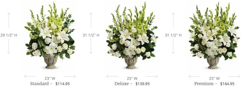 White roses, white asiatic lilies, green gladioli, white carnations, bells of ireland, white snapdragons, and white stock are accented with myrtle, green ti leaves, and lemon leaf. Delivered in a Thoughtful Tribute pot.
