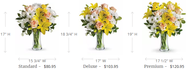 The song says, "The sun'll come out tomorrow," but why not today? Whatever the weather, this sunny bouquet of yellow, peach and white flowers will brighten any day instantly. Perfect for a birthday, thank you or just because.