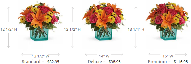 A party of petals! Celebrate any occasion with this fun-filled bouquet that brightens their day with fuchsia roses and orange liles, presented in a beautifully contrasting turquiose cube vase.