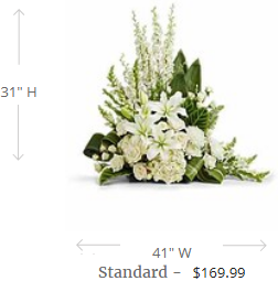 Large hydrangeas are beautifully paired with white roses and lush greenery, featuring soft, airy sword fern and glossy aspidistra leaves. Please note: the arrangement does not include an urn.